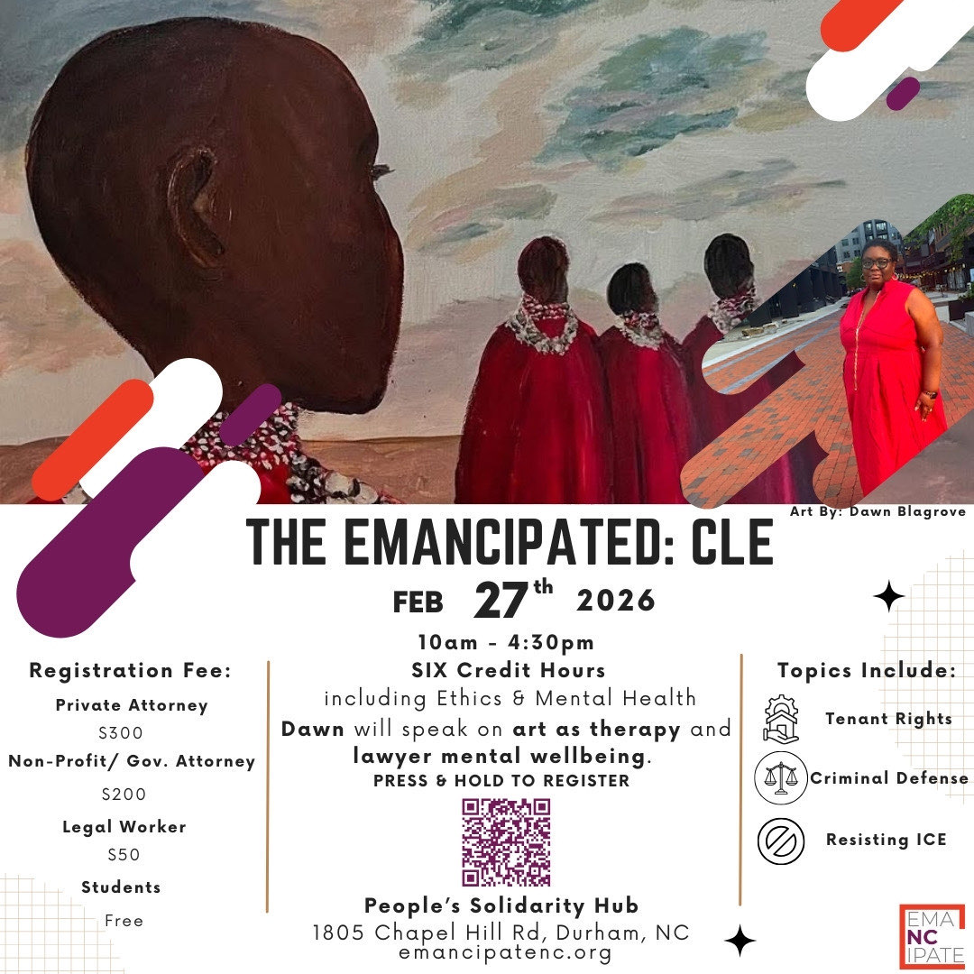 We invite you to join us for the EMANCIPATED CLE on February 27 in Durham — a full day of learning, connection, and practical tools for justice-focused lawyering.